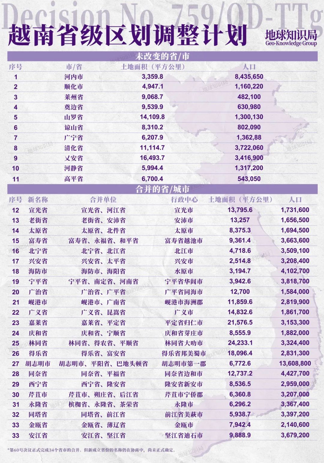 4月12日,越共第十三届中央委员会第十一次会议发布的第60号决议(60-NQ/TW),正式对外公布34个省级行政单位名称及其省会拟定方案:“63个省市合并为34个,包括28个省和6个中央直辖市。越南现有的63个省市, 11个省市不进行合并调整;剩下52个省市合并为23个新行政单位。”