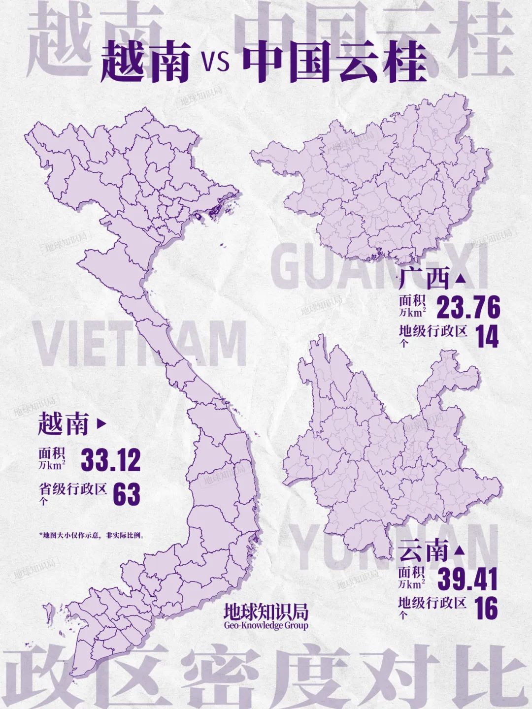 反观中国的云南,目前只有16个市州,广西也只有14个地级市。取个平均数,越南的数量是中国的四倍。按照这个计算方式,相当于越南的一个省对标中国云桂的2~3个县。